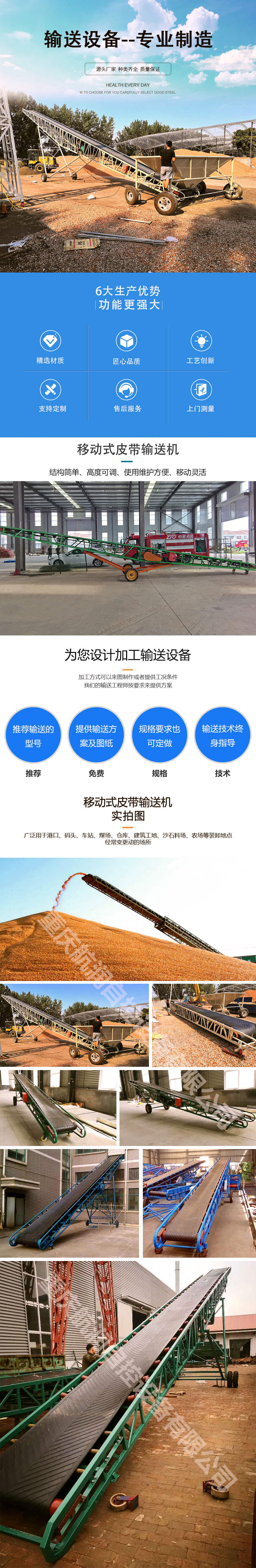 移動皮帶(dài)輸送機是一種效率高,使用機(jī)動(dòng)性好的連續輸送裝卸設備。結構簡單、高度可調、使用維護方便、移動靈活、輕巧美觀; 廣泛用(yòng)於港口、碼頭、車站、煤場、倉庫、建築工地、沙石料場、農場等裝卸地點經常變更動(dòng)的場所。