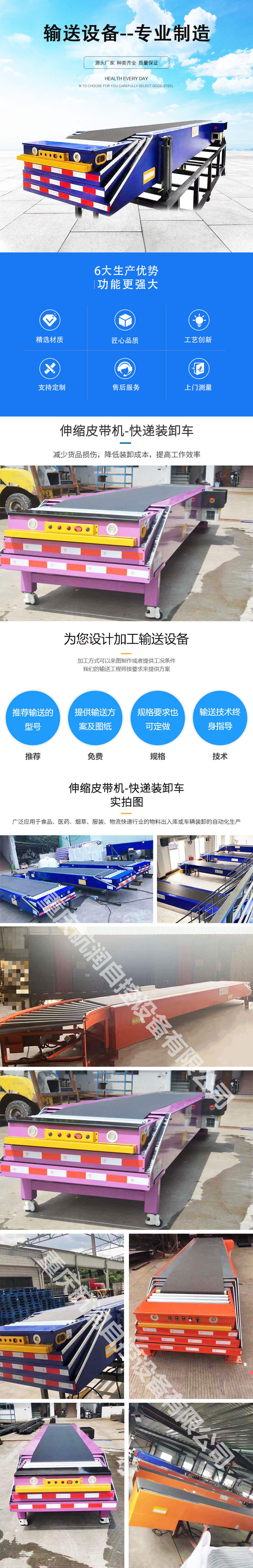 伸縮皮帶輸送機在長度(dù)方(fāng)向上可(kě)以(yǐ)自由伸(shēn)縮,雙向運轉輸送物料,可與其它(tā)輸送設備和物(wù)料分揀係統配合使(shǐ)用(yòng),能縮短了人工往返搬運物料的距離(lí),還可以縮短貨物裝卸貨時間(jiān),降低勞動強度(dù),減少貨(huò)品損傷,降低(dī)裝卸成本,提高工作效率; 廣(guǎng)泛應用於食品、醫藥、煙草、服裝、物流快遞行業(yè)的物料出入庫或車輛裝卸的自動化生產。