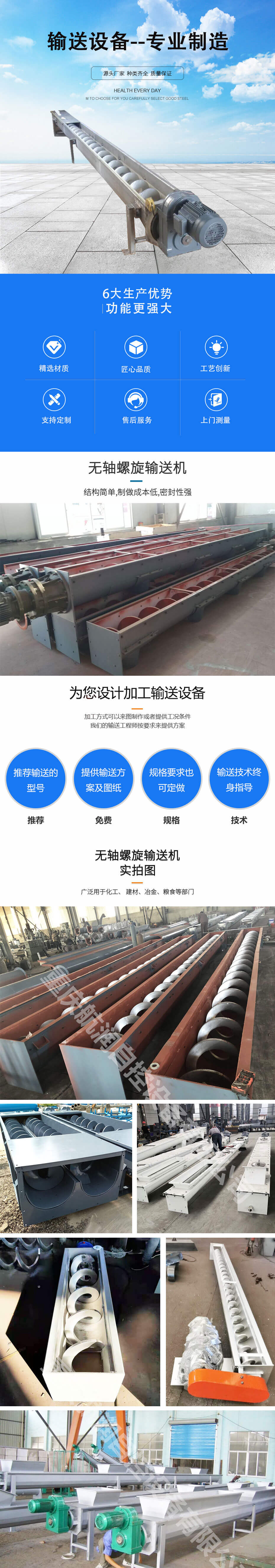 無軸螺(luó)旋輸送機(jī)采用無中心軸設計,抗纏繞性強、物料(liào)不易堵塞、輸送量大、能耗低(dī)、密封性強、操作安全,對於輸送帶狀、易纏繞物料有特殊的(de)優越性。 廣泛用(yòng)於化工、 建材、冶(yě)金、糧食等部門,在傾角β< 20 °的情況下,輸送粘度不大、不易變質、不蝗結塊的粉狀、顆粒狀和小塊物料。